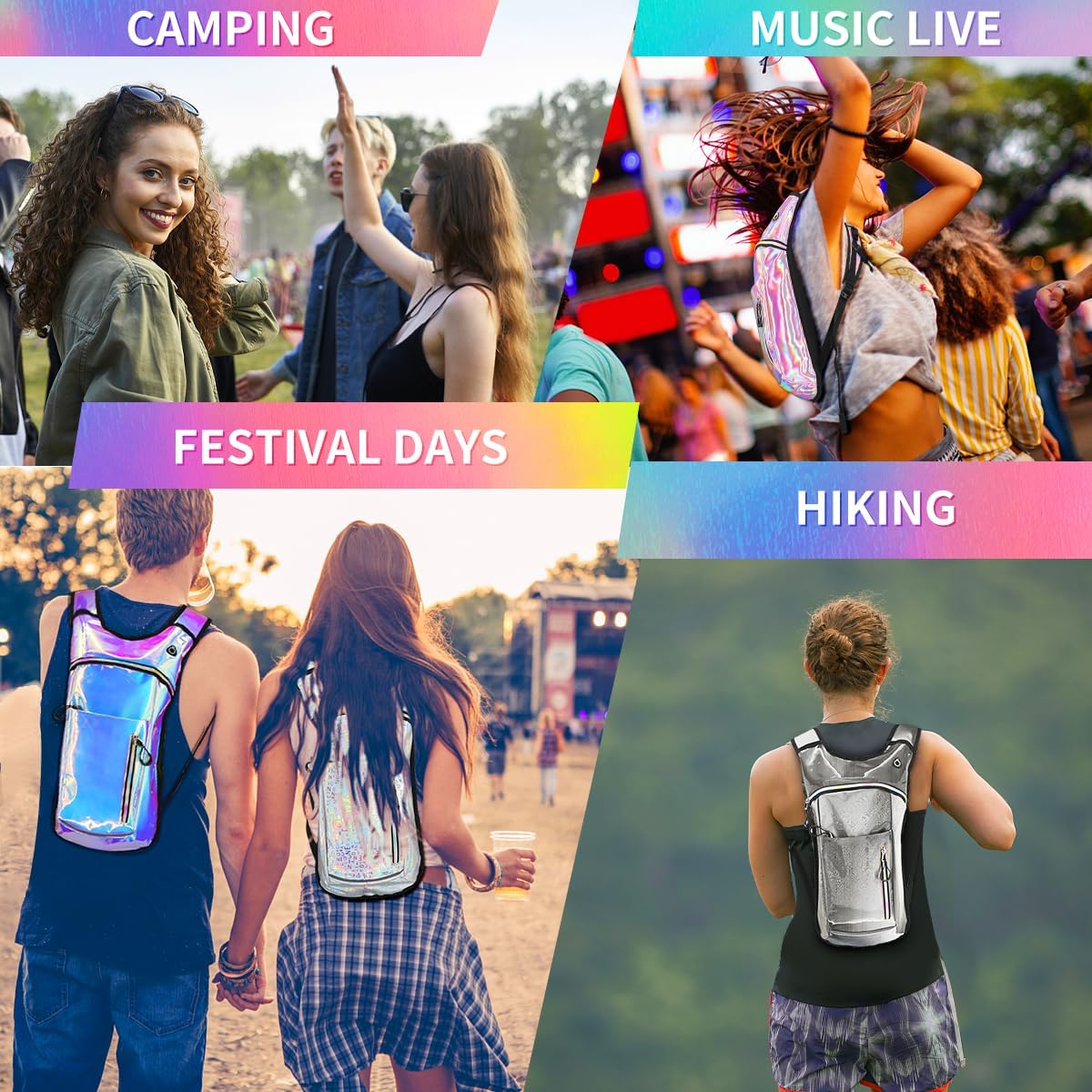 Features a hologram laser finish that reflects light beautifully, making it a standout choice for raves, music festivals, and outdoor activities. Water-resistant material adds durability while maintaining a sleek, lightweight feel. Designed for anyone who wants both function and fashion. Available in versatile colors to match any festival outfit or adventure style.